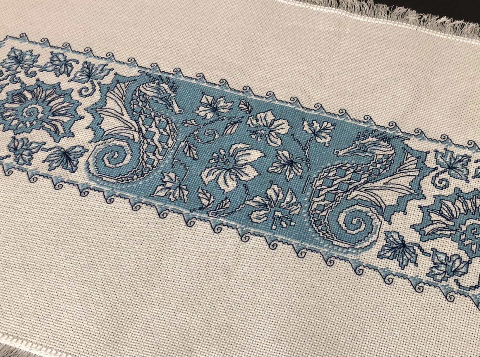 The work is done with the Assisi technique. The size of the napkin is 62×32 cm. The size of the panel is 45×16 cm. The package design of the purchased kit may differ from the photo on the site.